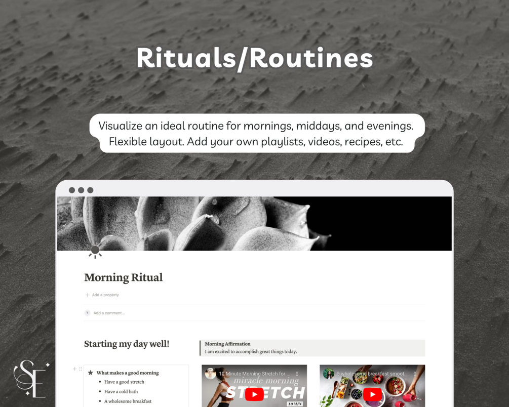 • Morning, Midday, and Evening routines: Visualize your ideal routines with dedicated pages designed to help you create structure and balance in your daily life. Use this section to outline your rituals and reinforce positive behaviors.
