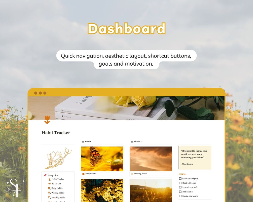 • Dashboard: Aesthetic design, set your goals, motivations, and more. Bonus one-click shortcut buttons.