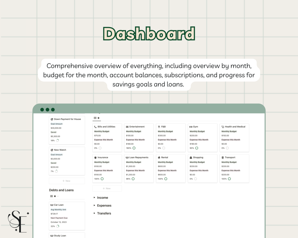 • Dashboard: Monthly Overview of your income and expenses and your balance. Track your expenditure against your budgets set. See your progress towards your savings goals, track your debt and upcoming payments, and next renewal dates for active subscriptions.